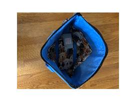This wonderful and adorable handmade dog tote has 6 pockets, a zipper closure, and a removable bottom insert.