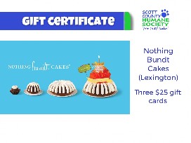 Three $25 gift cards for cake purchase at the Lexington Nothing Bundt Cakes, 2358 Nicholasville Rd. Share with friends or bundle for $75 toward your own bundt delight!
