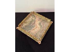 Cut from translucent Green Onyx, "La Joie du Printemps" Gold Leafe Bronze footed square tray encrusted with Peridot, Pink Tourmaline, Rhodolite Garnet, Green Riverr Basic Diopside, and Lemon Topaz. The corners of the piece are adorned with Gold Leafed, Hand stamped Brass Flowers that are sprinkled with Pink TOurmaline. The underside of the tray is enhanced with Peridot and Golden Mica Flakes. The piece has been covered with a finish incorporating Pear Dust. This tray is one of a kind and is signed by the artist.