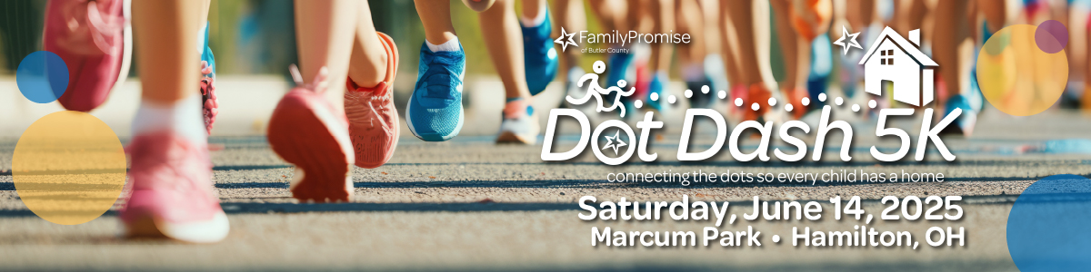 As a Dot Dash Sponsor, you will join Family Promise of Butler County and other community leaders, business partners and Butler County citizens to help eradicate family homelessness in a fun but impactful way - to literally connect the dots in our community to ensure every child has a home. *SPONSORSHIPS MUST BE SUBMITTED BY MAY 16 FOR LOGO PLACEMENT ON T-SHIRTS AND OTHER PROMOTIONAL ITEMS. THANK YOU!