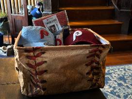 4 tickets to a Phillies game, along with a $25 Primo gift card, two Phillies hats, a garden banner, and the very necessary Phillies can koozie.