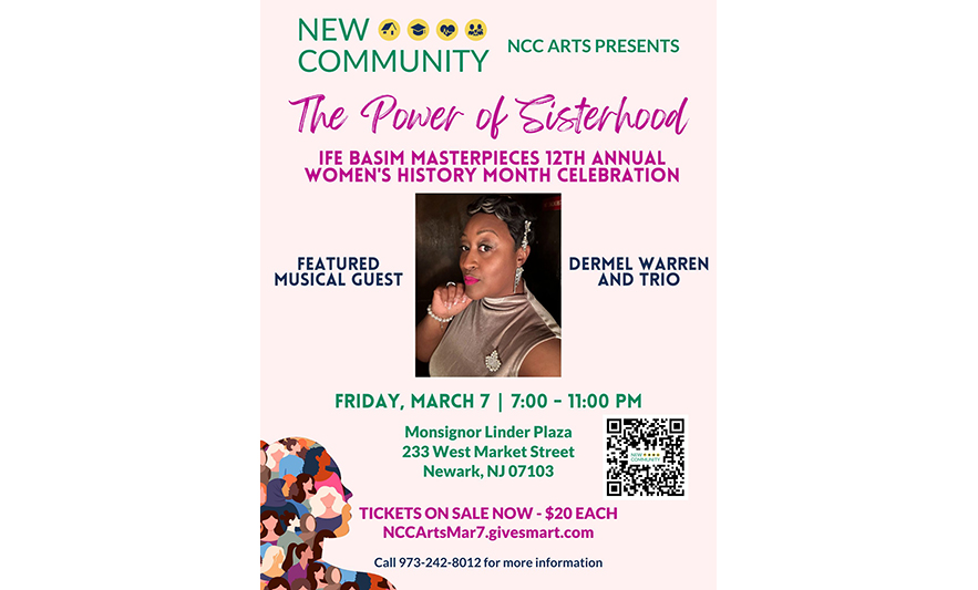 Join New Community Arts on Friday, March 7 for The Power of Sisterhood, Ife Basim Masterpieces 12th Annual Women's History Month Celebration, from 7 to 11 p.m. at Monsignor William J. Linder Plaza, 233 West Market St., Newark. The featured musical guest is Dermel Warren and Trio.