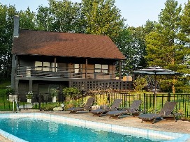 This inviting three-bedroom, two-bathroom luxury log cabin comfortably accommodates up to six guests and offers panoramic vistas of lush fields and serene forests. Unwind in style with amenities including a refreshing pool, a BBQ grill for outdoor gatherings, a cozy fireplace for those chilly evenings, and the convenience of a washer/dryer.