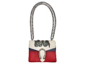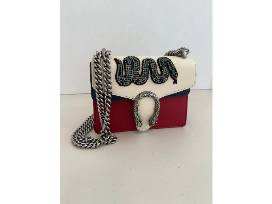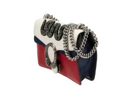Striking red/white/navy leather mini with crystal-embroidered snake, Gucci's signature tiger-head spur closure, and an adjustable chain strap for shoulder or crossbody wear. Compact yet functional with two compartments and a slip pocket-an eye-catching statement piece perfect for collectors and style lovers alike. Made in Italy.
