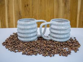 Two handmade ceramic mugs made by Arbor Grove Ceramics made with a speckled stoneware clay and a smooth, shiny white glaze. Each mug holds approximately 12 oz of your favorite beverage (microwave and dishwasher safe, though hand washing is recommended). Enjoy with a lovely Stumptown gift package!