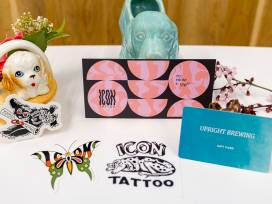 Have an east side day for the surprise lover with this Icon Tattoo gift card for $100, a $25 Upright Brewing gift card, Portland Leather Goods Mini Crossbody bag, and Mystery Box.