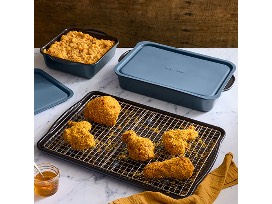 Pampered Chef 6-piece bakeware set has everything you need to bake a homemade meal. It includes the 9'' x 13'' (23-cm x 33-cm) Brilliance Nonstick Baking Pan With Lid, 8'' (20-cm) Brilliance Nonstick Square Pan With Lid, and Brilliance Nonstick Half Sheet Pan With Rack. Each pan heats quickly and perfectly cooks casseroles, breads, roasts, and even desserts. It's also the ideal meal-making set for newlyweds and first-time homeowners. If applicable, winner will pay shipping charges.