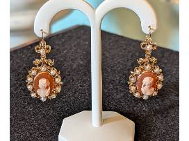 Antique stone cameo drop earrings of 14karat yellow gold with pearl accents.