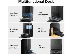 All-in-One Multifunctional Dock: The 6-in-1 dock offers hands-free convenience with an automatic mop washing system, dynamic speed, and water flow adjustment for efficient cleaning. A 2.7L dust bag provides up to 7 weeks of hands-free cleaning, while the 4L clean water tank covers 3,552 sqft. The removable dock base is easy to clean, and quick-charge keeps the robot ready for use.