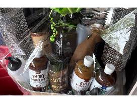 Everything you need to become a BBQ master in your own backyard - tools, snack from Trader Joe's, assorted sauces - some from Famous Dave's, rubs, apron, cutting board, and vegetable roasters. Make a Jack Daniels drink for yourself too.