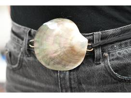 Two handmade pieces: shell belt and pearl chandelier earrings