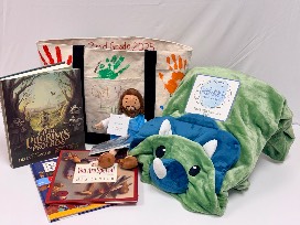 The bag is filled with cozy, kid-friendly goodies, including: 3 books, a soft Jesus stuffie doll, a handy book light, and a cuddly hooded Dino blanket.