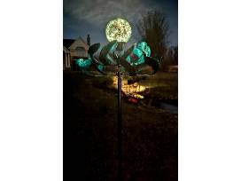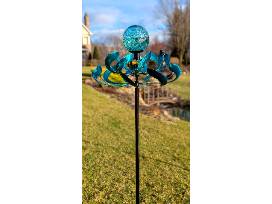 During the day, its metallic teal and aqua blades gracefully spin in the breeze, reflecting light with an iridescent glow. As evening falls, the crackled glass orb atop the spinner comes to life-its built-in solar-powered LED casting a soft, enchanting light that illuminates your yard or garden path.