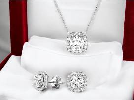 The necklace and earrings are crafted from solid 925 sterling silver and overlaid with white gold to ensure durability and a luxurious finish. Each simulated diamond is carefully selected for its sheen and brilliance. The chain measures 18 inches and has a lobster clasp. All pieces in the set are hypoallergenic.