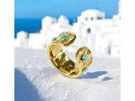 The outer band features exquisite sunburst engravings that radiate brilliance, highlighted by vibrant turquoise stones. Each stone, reminiscent of the crystal-clear waters of the Aegean Sea, is perfectly set to create a striking contrast against the golden backdrop. This stunning design brings Mediterranean charm to your fingertips, making it a show-stopping addition to any jewelry collection.