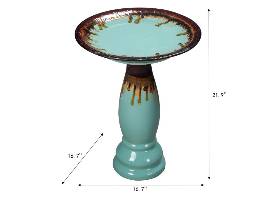 This charming glazed birdbath is the perfect hang-out for your feathered friends. The teal is a dynamic dark burnished brown glaze dripping down the teal pedestal to add a dark accent to the boho coastal look. With the shallow floral basin holding just a little over half a gallon of water, your little birdy companions have the perfect amount of water to drink and bathe in.
