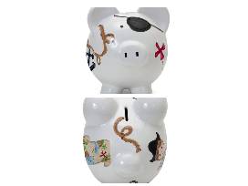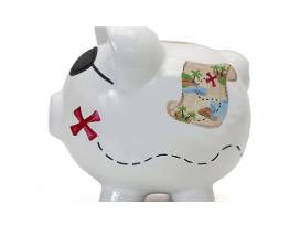 X marks the spot for this unique piggy bank! This pirate-themed bank features a hand-painted pirate and a treasure map, along with other pirate-themed accents. It also has an eye patch. Made from dolomite (a high-quality ceramic) to increase durability. The white base is deep-glazed to remain vibrant over time. To finish things off, we add a shiny finish that keeps the colors of all of the underlying components locked in place, meaning that you never have to worry about compromising the quality of the bank with repeated use.