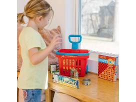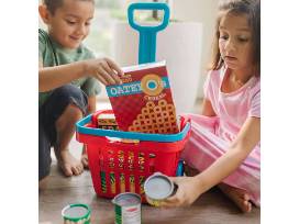 Load up on play kitchen and grocery store essentials and get playtime rolling with this durable rolling grocery basket filled with play food boxes and cans! Lift the basket handle to carry, or extend to roll. Mark the double-sided reusable shopping list with a pencil that stores in the side of the basket! The play set includes five colorfully labeled grocery boxes and three play food cans with pop-off lids for a realistic shopping experience for kids three and older.