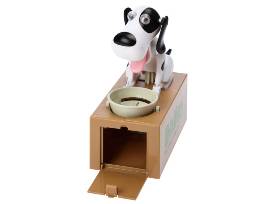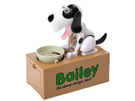 Recruit an adorable dog to make saving money fun, and to teach kids how to pinch pennies for the future! Simply place coins inside of Bailey's food dish, then the cute black and tan puppy "devours" the money for a rainy day. As he leans down to eat, the dish get tipped and the coins fall into the bank. Plastic bank uses 2 AA batteries (not included). For ages 5+. Dog bank stands 8".