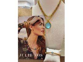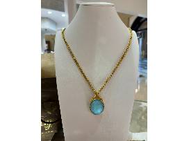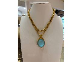 Perfect for Summertime! You will definitely get noticed with these showstoppers, the "Julie Vos" necklace with matching bangle provided by Anfesa's Jewelers. This piece is a stunning oval Nassau Iridescent Capri Blue Pendant with a twisted golden rope bail dangles from this elegant necklace's rolo chain. It is 24K gold plate with imported glass and measures 35.5 inches long or 18.5 inches doubled and closes with lobster clasp. The Pendant measures 2 inches drop length. The bracelet has a gorgeous Nassau Iridescent Capri Blue with oval gemstones evenly spaced along a loop of twisted golden rope. It is on a 24K gold plate with imported glass had inner circumference is 7.8" and 0.3 inches wide.