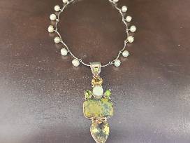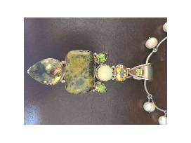 Megan is known in the jewelry world for her expertise in polishing rare stones and crafting them into unique sterling based jewelry. This piece is Hallmarked MD 925 It is a Sterling with Peridot Citrine Green Amethyst and Gaspeite (rare nickel carbonate mineral) pendant on a 17-freshwater pearl and sterling necklace. Megan is a 4th tier PMC Certified Instructor.