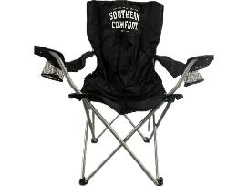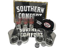 This unique collection of Southern Comfort branded items includes whiskey discs, an 11" stainless steel stirrer, two black hats with patch logos, a tin tacker, twelve rocks glasses, six Tom Collins glasses, a service mat, six Koozies, and two football tailgate folding chairs. All items are branded with the Southern Comfort logo and perfect for any fan.