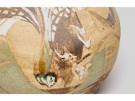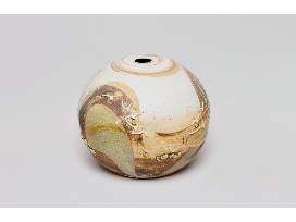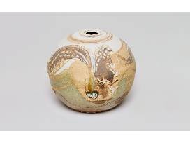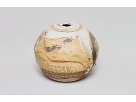 Rogers says about this work: I am thrilled to reacquaint myself with what I describe as one of my "travel pieces"; a series of pots I have continued to make since the 1980's inspired not only by the landscapes and architecture of each country I have traveled to, but also their pots. This is what I call a 'Globe pot' inspired by the spherical shapes of African pottery; and on it is an abstraction of an ancient Spanish cliffside town, with birds flying below (Arcos de la Frontera). I use a stoneware clay body with clay slips, porcelain additions, wax and glaze.