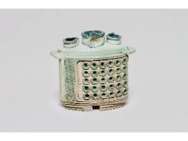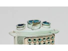After moving to Arizona in 2004, Sandy set-up a ceramic studio working with mid-range stoneware and emphasizing functional vessel forms. Her work is inspired by nature as well as architecture and industrial objects. Utilizing handbuilt slab-construction techniques for the simplified forms, and heavily marked / texture impressed surfaces, the combination is enhanced with multiple layers of sprayed glazes. Surface depth with subtle color variation help to convey a timeless expressive personal statement.