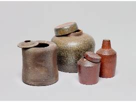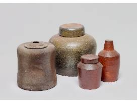 A collection of four vessels of various sizes, claybodies, and storage methods. This set of covered vessels shows off the beauty achievable through salt and wood firing. They each speak to the history of well made ceramic vessels from around the world. The history of Japanese, British, German, and Pennsylvania German storage vessels echo through this grouping. The clean lines and references to history could look either contemporary or give an air of tradition to any collection.