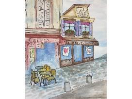 A scene of a romantic, candlelit French marketplace. This Watercolor and ink piece measures 15x12 and was created by Maddie Hawkins.