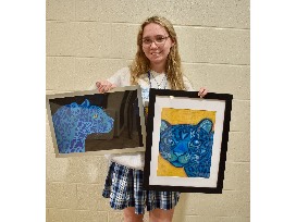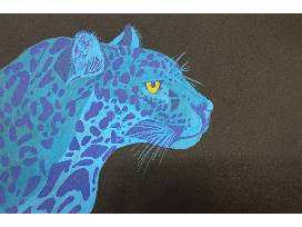 A blue jaguar with hearts in its markings. This oil pastel piece measures 9x12 and was created by Bella Houston.