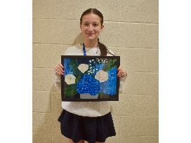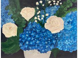 A boutique of flowers consisting of hydrangeas and roses. This acrylic paint piece measures 11x14 and was created by Emmie Brown.