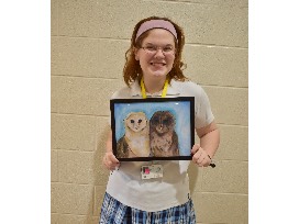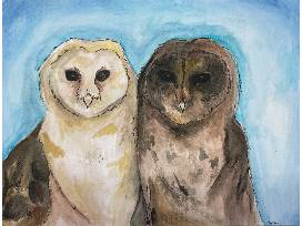 Two owls huddled together for warmth with a blue background. This watercolor and ink piece measures 9x12 and was created by Hilary Bowman.