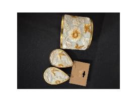 Stunning coordinated jewelry and accessory set featuring exquisite floral embroidery in gold and cream tones. This beautiful collection includes a matching gold cuff bracelet and teardrop earrings, both showcasing delicate embroidered fabric with botanical motifs of blooming flowers and leaves. The bracelet features a wide gold-trimmed band, while the statement earrings offer a dramatic teardrop silhouette with gold edging. Perfect for weddings, garden parties, or any special occasion!