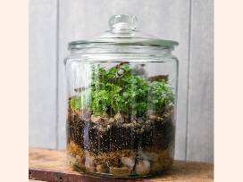 A classic, American-made gallon apothecary jar transformed into a miniature woodland landscape. The apothecary terrariums feature miniature ferns and small plants from Michler's greenhouses.