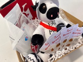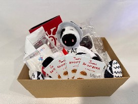 Chick Fil A gift package that includes plush cow, popsocket, koozie, sunglasses and FOUR gift cards.