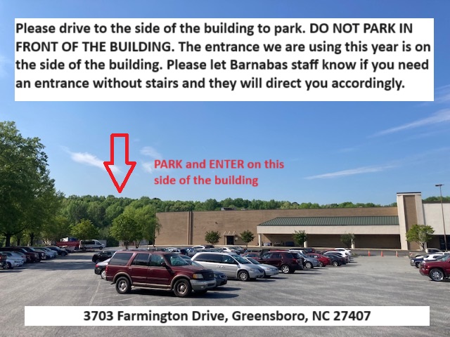 The auction location is in the Stonesthrow Shopping Center at 3703 Farmington Drive, Greensboro, NC 27407. Please drive to the side of the building to park. DO NOT PARK IN THE FRONT OF THE BUILDING. Park beside the building. The entrance we are using this year is on the side of the building. Please let Barnabas staff know if you need an entrance without stairs and they will direct you accordingly. Thank you!