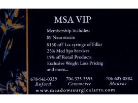 Meadows Surgical Arts Membership - 1 memberships (discounted services: $9/unit Botox or Dysport, $150 off per syringe of filler, 15% off retail products, 25% off med spa treatments, and discounted weight loss injections)