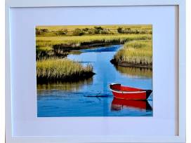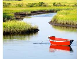 A vivid red rowboat rests quietly on calm water, surrounded by lush green marsh grasses and bathed in soft, natural light. This striking image evokes a sense of solitude, reflection, and the quiet beauty of the Cape's coastal landscapes.
