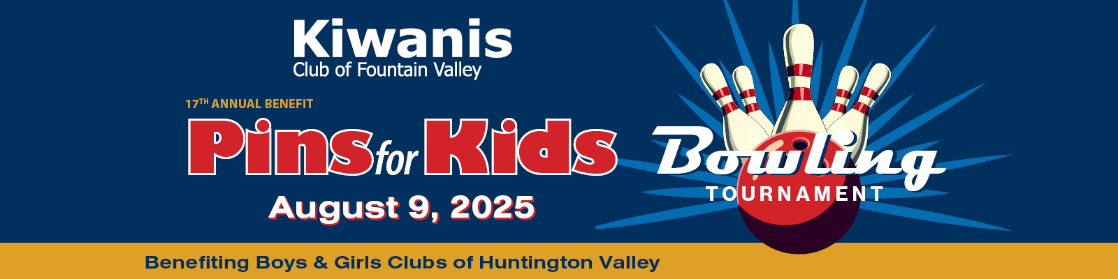Donate an Item NowBoys & Girls Clubs of Huntington Valley and the Fountain Valley Kiwanis Club are teaming up to make a difference to our community's kids through the Annual Pins for Kids Bowling Tournament on August 9, 2025 at the Fountain Valley Bowling Center. We'll also have an online auction to help raise funds for our two great causes!