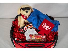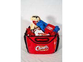 This one-of-a-kind Raising Cane's basket comes loaded inside a stylish Cane's soft cooler, perfect for any fan of the chicken finger favorite! Inside, you'll find gift cards for two box combo meals, one kids meals, and three 22oz Lemonades!.