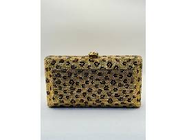 Leopard Print Evening Clutch: A stunning gold and black beaded clutch with a chic leopard print pattern, featuring a matching chain strap for versatile styling.