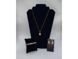 Necklace: A brilliant teardrop pendant adorned with pave-set crystals, elegantly suspended on a gold-toned chain.