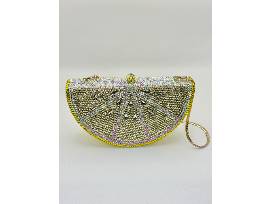 Designed in the shape of a lemon wedge, this dazzling handbag features golden and iridescent crystals that shimmer with every movement. Playful yet classy, it's a bold conversation piece with a practical chain strap for ease of wear.