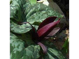 Noted for its subtle beauty, Toadshade or Red Toad Trillium produces whorls of oval deep green leaves marbles with pale, silvery green and bonze-maroon. In mid to late spring, stalkless, upright, wine-red to burgundy flowers appear. The petals stand up straight and barely open. Easy to grow and likes shade.