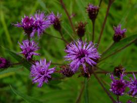 New York ironweed is a tall perennial growing 5' to 8' in height. Small reddish-purple flowers occur in large clusters blooming from late summer into fall. The source of its name has been attributed to certain "iron-like" plant qualities including tough stems, the rust-tinged color of its fading flowers, and the rust-colored seeds. Native Americans made a tea from the plant to treat medical conditions including childbirth pain, stomach ulcers, and loose teeth. The flowers attract butterflies and seed heads attract birds.