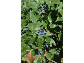 The Lowbush or Wild Blueberry is native to the northeastern United States. Its small but very flavorful berries are almost candy-sweet, with an intense blueberry flavor. Small white flowers bloom in early spring and offer a valuable nectar source to native bees. The fruit ripens in summer and is a favorite of birds. Lowbush Blueberry leaves turn bronze, scarlet, and crimson in fall. The berries were an important food source for Native Americans who ate them fresh, dried, and baked, and added to soups or mixed with venison and other meats. Early European settlers ate the fruit fresh and used it to make jams, jellies, and preserves.