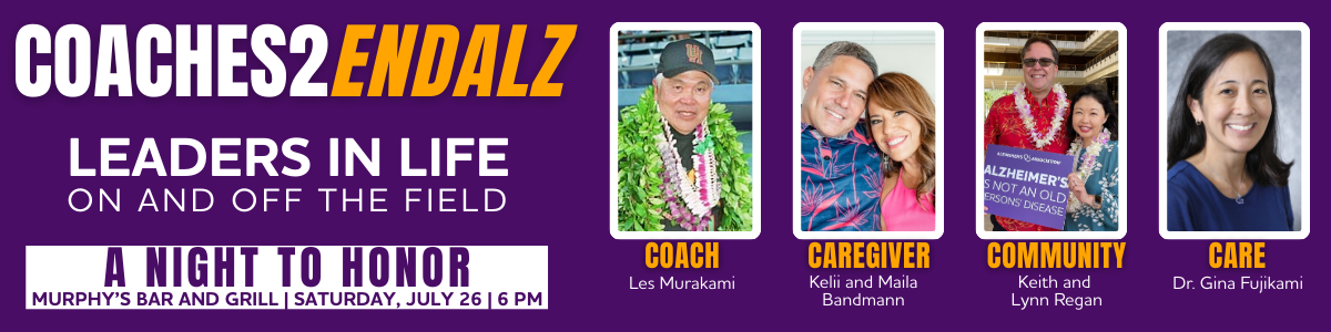 Kelii Bandmann & Maila Gibson-Bandmann: As a Na Hoku Hanohano Award winner in Hawaii's music industry, Maila Gibson-Bandmann has found a passion equal to her passion for music - helping people get the most out of real estate ownership in Hawaii. Kelii is a Certified Workplace Wellness Advisor for UHA Health helping organizations create and maintain programs that support the health and well-being of employees. He designs, implements and oversees wellness initiatives that promote physical, mental, and emotional health in the workplace. In addition to their service-oriented careers, Kelii & Maila have made life-changing sacrifices over the past few years as they became the full-time caregivers for Kelii's mom living with Alzheimer's while also becoming "Purple Ambassadors' for the Alzheimer's Association. We honor them for their love and dedication along with Kelli's mom, Edith Bandmann, who passed away on March 4th.