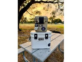 A must-have bundle for any outdoor enthusiast: the YETI Roadie 15 Cooler, YETI GoBox, and HLM branded swag.