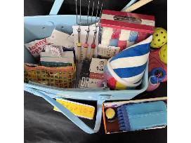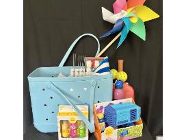 Summer fun in a large waterproof tote! An assortment of kids beach and backyard toys, new water bottle, selection of summer novels, and so much more, this basket gives you everything you could need to get the whole family ready for days of fun.